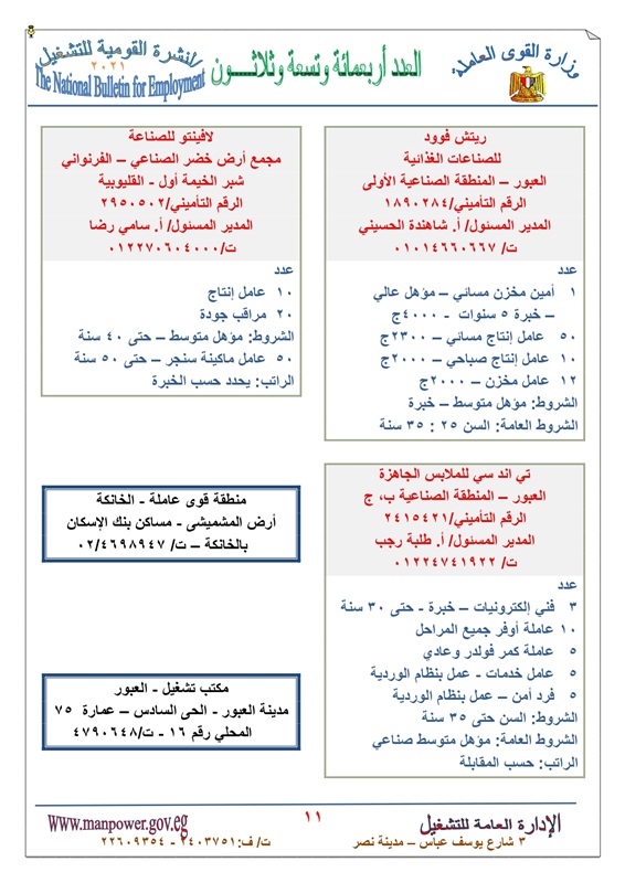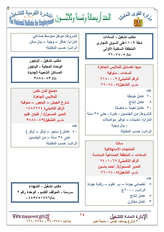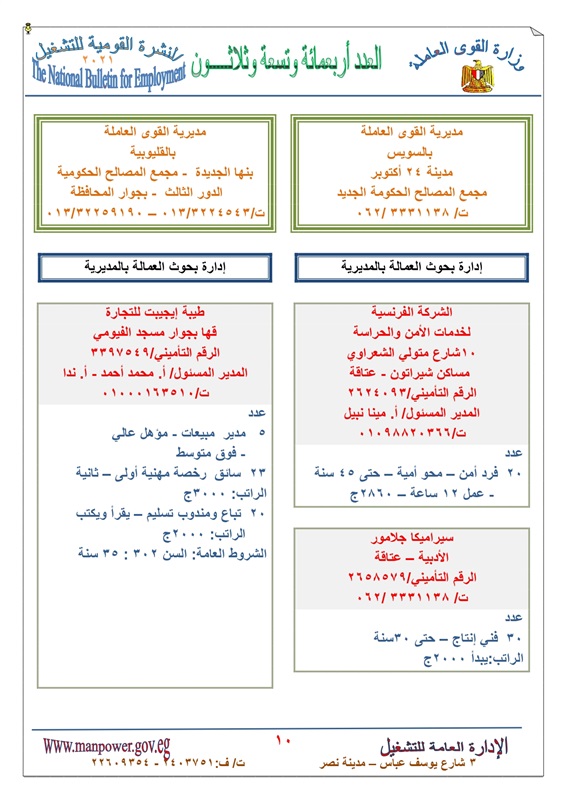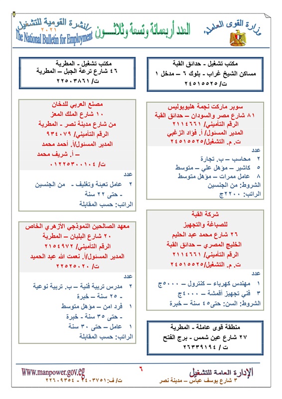 وأوضحت أن هذه الفرصة متوفرة فى 11 محافظة هى: القاهرة ، والقليوبية ، وأسيوط ، والغربية، والدقهلية، والسويس، ودمياط ، وقنا ، والمنوفية ، والإسكندرية ، والشرقية كما تناولت النشرة إعادة نشر لوظائف لم يتم شغلها من سبتمبر 2021 فى النشرة السابقة وعددها 262 فرصة عمل.