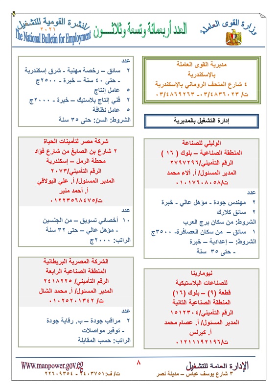 كما وفرت مديرية القوى العاملة بالغربية مجموعة من فرص العمل شملت : 40 وكيل تأمين أفراد وبنكى ، و 3 مدرس علوم ولغة إنجليزية ، و 4 عمال إنتاج .