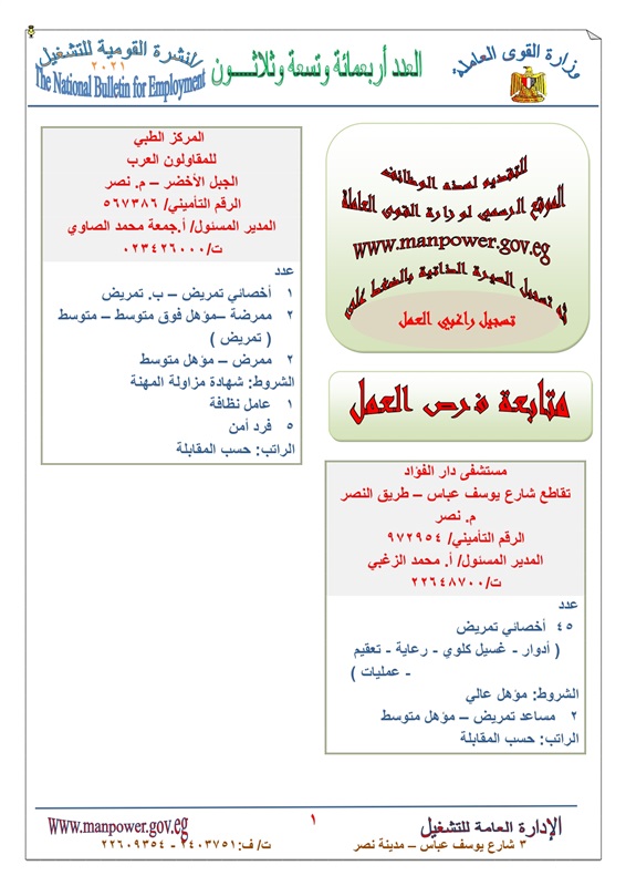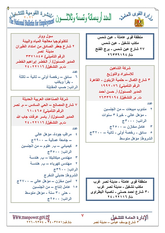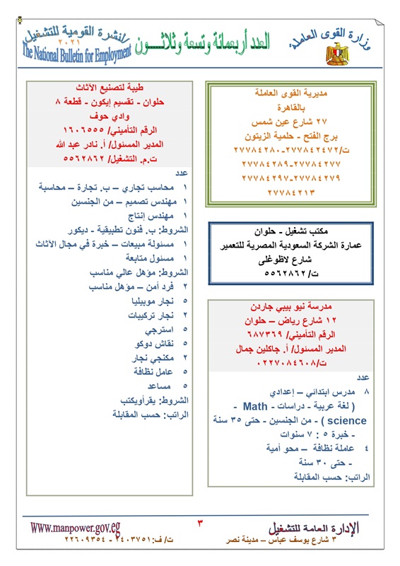 ولفتت إلى أن فرص العمل المتوفرة بالقاهرة تتمثل فى 33 مدرس ابتدائى وإعدادى وثانوى ، و 4 محاسب تجارى ، ومهندس تصميم ، و 3 مهندس ميكانيكى ، و 3 مهندس كهرباء ، و 45 اخصائى تمريض ( أدوار - غسيل كلوى - رعاية - تعقيم عمليات ) ، و 6 مساعد تمريض ، و 7 ممرض وممرضة ، و 3 مسئول مبيعات ، و 15 عامل إنتاج ، و 14 مندوب مبيعات ، و 5 كيميائى ، و 14 مراقب جودة ، و 8 فرد أمن ، و11 عامل نظافة ، و 18 سائق رخصة ثانية ، و12 سائق مبيعات ، و 27 عامل من ذوى الهمم لاستكمال نسبة 5 % ، و 2 أمين مخزن ، و 30 عامل ماكينة ، و 6 عمال مخزن ، و 5 كاشير ، و 8 عمال ممرات ، و 3 فنى تجهيز اقمشة براتب 4000 جنيه ، و 5 مساعد ، و4 عامل مكواة ، و 2 مكنجى ، و 5 نقاش ، و 15 استرجى وفنى صيانة ماكينات خياطة .