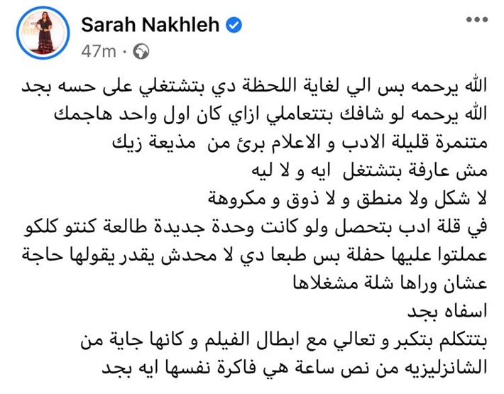كما دخلت الفنانة سارة نخلة على الخط وكتبت: "الله يرحمه بس لغاية اللحظة دي بتشتغلي على حسه بجد الله يرحمه لو شافك بتتعاملي إزاي كان أول واحد هاجمك"، واختتمت سارة حديثها قائلة "آسفة بجد بتتكلم بتكبر وتعالي مع أبطال الفيلم وكأنها جاية من الشانزليزية من نص ساعة هي فاكرة نفسها إيه بجد".