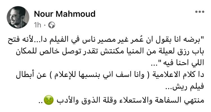 أيضا الفنان نور محمود علق على الأمر وكتب نشر كلام بوسي وكتب: "دة كلام الإعلامية وأنا آسف إني بنسبها للإعلام عن أبطال فيلم ريش منتهى السفاهة والاستعلاء وقلة الذوق والأدب".