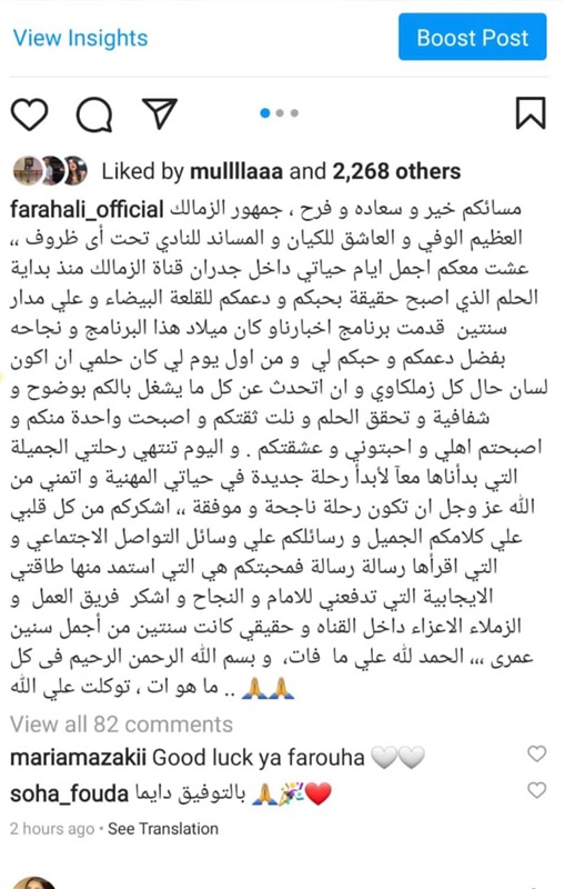 وأضافت فرح خلال رسالتها :"علي مدار سنتين قدمت برنامج اخبارنا و كان ميلاد هذا البرنامج و نجاحه بفضل دعمكم و حبكم لي و من اول يوم لي كان حلمي ان اكون لسان حال كل زملكاوي و ان اتحدث عن كل ما يشغل بالكم بوضوح و شفافية و تحقق الحلم و نلت ثقتكم و اصبحت واحدة منكم و اصبحتم اهلي و احبتوني و عشقتكم".