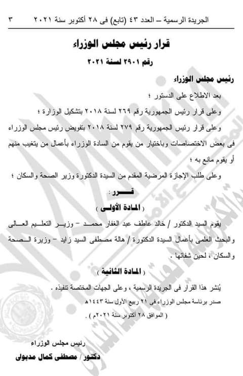 وجاء في القرار أنه صدر بعد تقدم دكتور هالة زايد وزيرة الصحة بطلب إجازة مرضية.