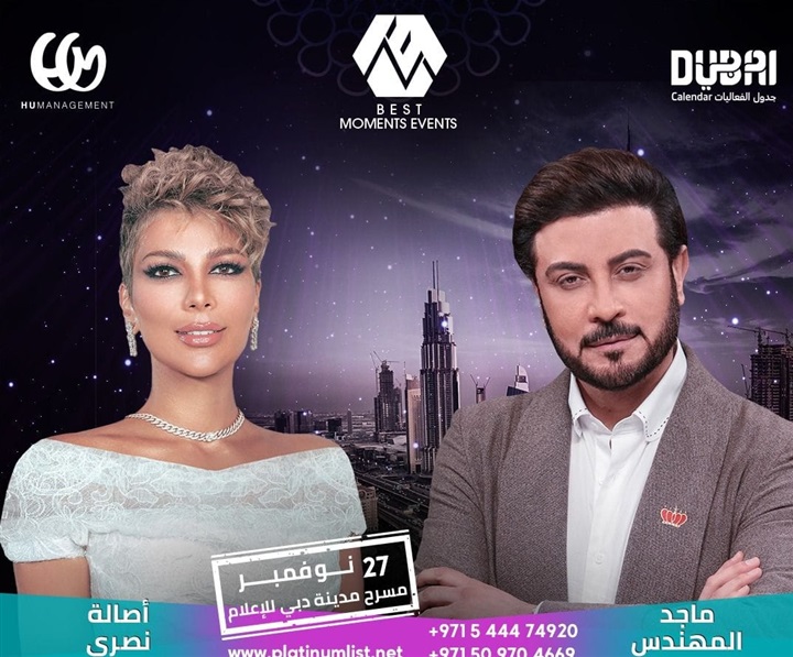 في حين تختتم ثلاثية حفلات "Moment Events" في دبي، بحفل غنائي مزدوج يجمع النجمة السورية أصالة نصري مع الفنان العراقي ماجد المهندس، في سهرة عاطفية آسرة مساء السبت 27 نوفمبر.