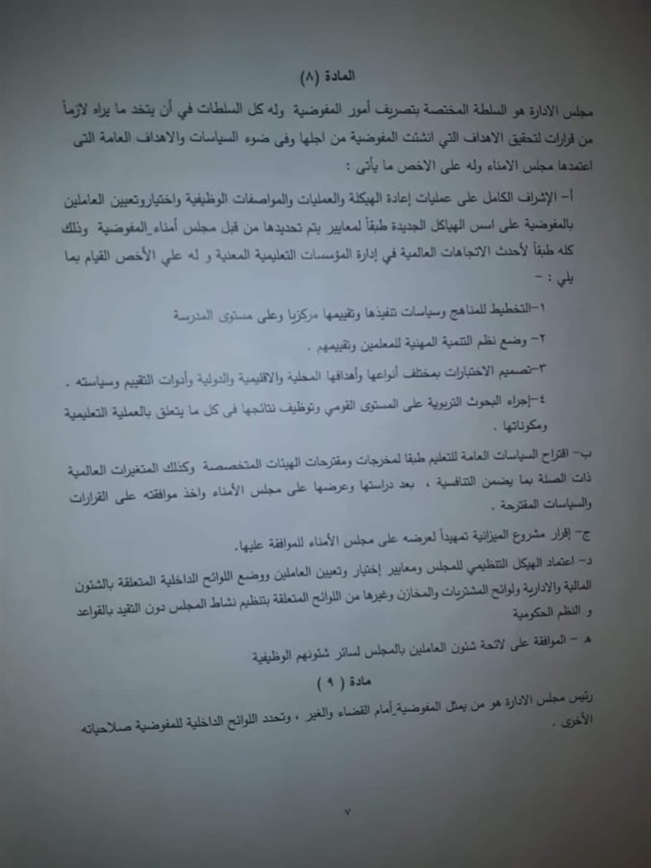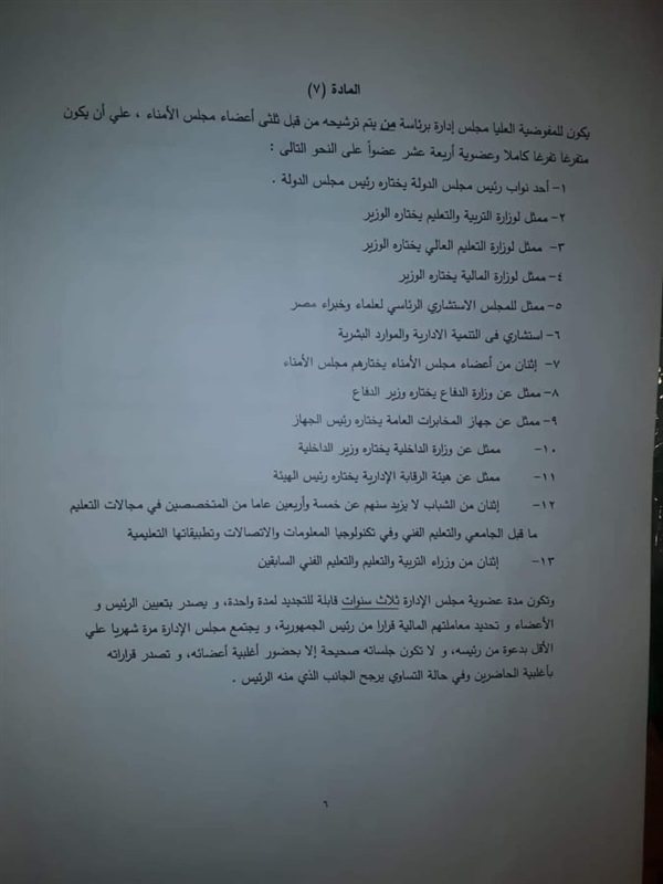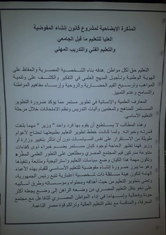 وأكد الشرقاوي أن هذه المفوضية تكون مهمتها وضع سياسات التعليم طويلة الامد - والتي تضمن استقرار نظام التعليم- وخطط تنفيذها مهما تغيرت الحكومات او تبدل الوزراء حتى نخرج من دائرة التغيير مع كل وزير.