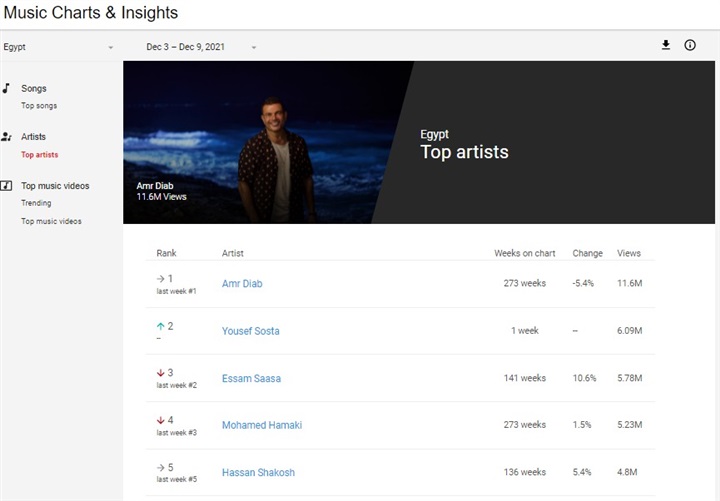 واصل النجم الكبير عمرو دياب تصدره لترتيب موقع يوتيوب ميوزيك للفنانين الأكثر استماعًا ومشاهدة فى مصر على موقع الفيديوهات الشهير هذا الأسبوع.