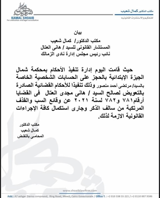 قامت إدارة تنفيذ الأحكام بمحكمة شمال الجيزة الابتدائية بالحجر على الحسابات الشخصية الخاصة بمرتضى منصور، رئيس مجلس إدارة نادي الزمالك، وذلك تنفيذًا للأحكام القضائية الصادرة بالتعويض لصالح هاني العتال، نائب رئيس مجلس إدارة نادي الزمالك.