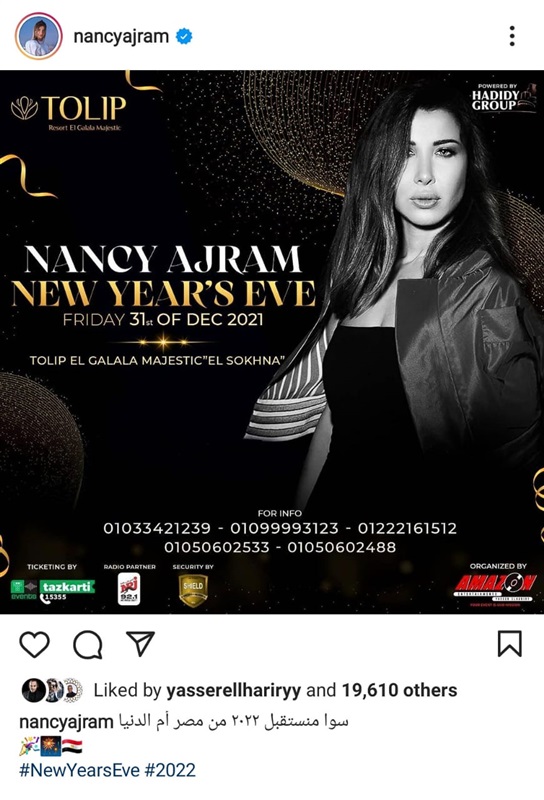 وعلقت نانسي على بوستر حفلها على حسابها بانستجرام قائلة: "سوا نستقبل 2022 من مصر أم الدنيا".