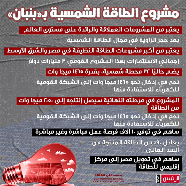 القومي 3 مليارات دولار يضم حاليًا 32 محطة شمسية، بقدرة 1465