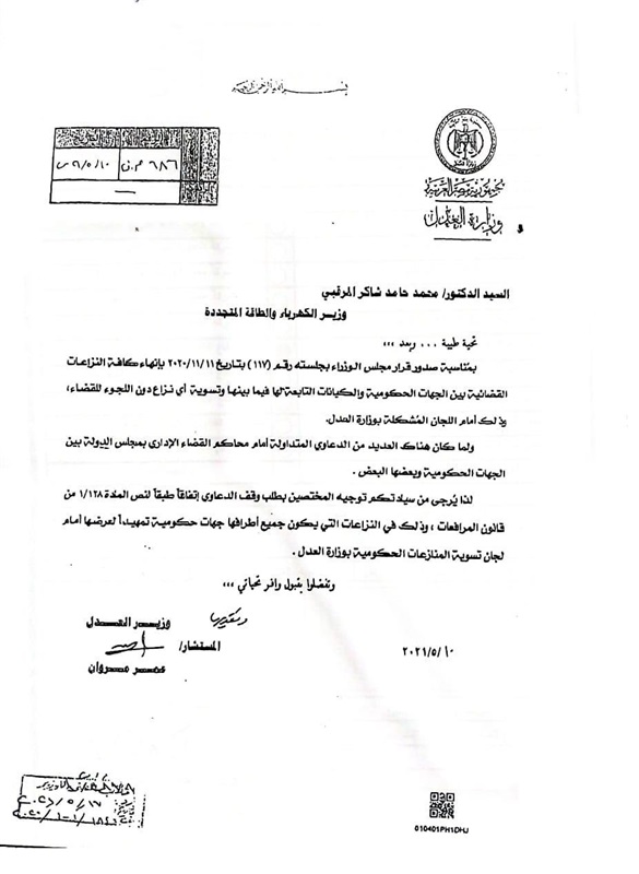 وطالب وزير العدل، خلال الخطاب الذي حصل "الرئيس نيوز" على نسخة منه، توجيه المختصين تحت رئاسة وزير الكهرباء والطاقة المتجددة بوقف جميع الدعاوى المتداولة أمام محاكم القضاء الإداري طبقا لقانون المرافعات لعرضها على لجنة فض المنازعات الحكومية بوزارة العدل وذلك حسب ما جاء في الخطاب وذلك في النزاعات التي تكون أطرافها جهات حكومية.