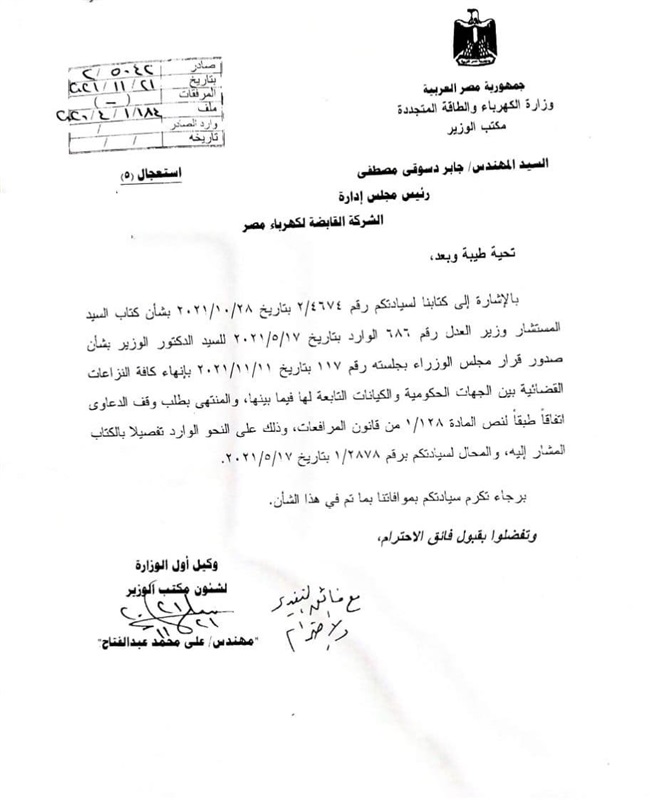 وفى سياق متصل، أرسل المهندس علي عبد الفتاح، وكيل أول الوزارة لشئون مكتب وزير الكهرباء، عدة خطابات للمهندس جابر دسوقي، رئيس الشركة القابضة لكهرباء مصر، للتنبيه على الشركات التابعة وعددها ١٧ شركة بالالتزام بما جاء بقرار مجلس الوزراء و خطاب وزير العدل وقام رئيس الشركة القابضة بإرسال الخطاب لجميع الشركات التابعة للشركة القابضة.