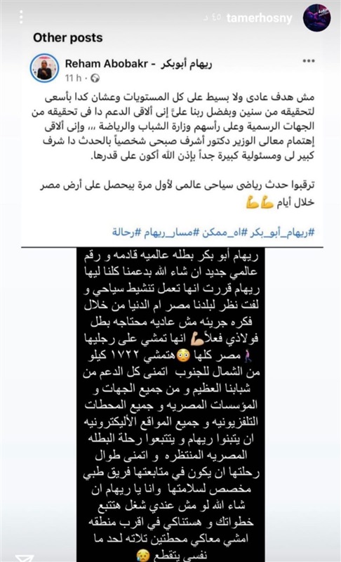 وأضاف نجم الجيل تامر حسنى فى منشوره عنها :"ريهام قررت انها تعمل تنشيط سياحى ولفت نظر لمصر أم الدنيا من خلال فكرة جريئة مش عادية محتاجة بطل فولاذى فعلا، وهى انها تمشى على رجليها مصر كلها، هتمشى 1722 كيلو من الشمال للجنوب".