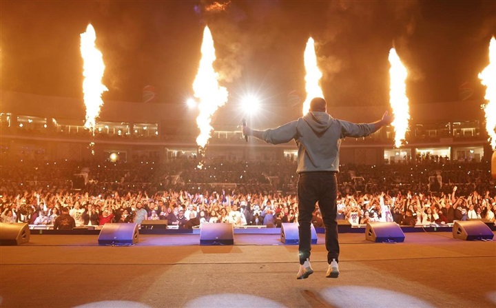 صعد عمرو دياب إلى المسرح مع أغنيته "يا أنا يا لأ"، وبعدها حرص على تحية الجمهور ووجه لهم كلمة قال فيها" بتوحشوني من فترة لفترة، بيوحشني أجي هنا وأغني وأبقى معاكم".