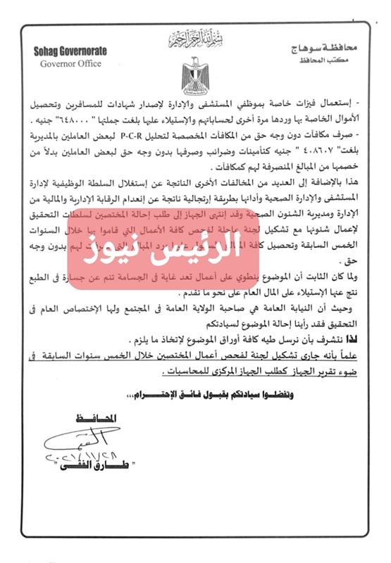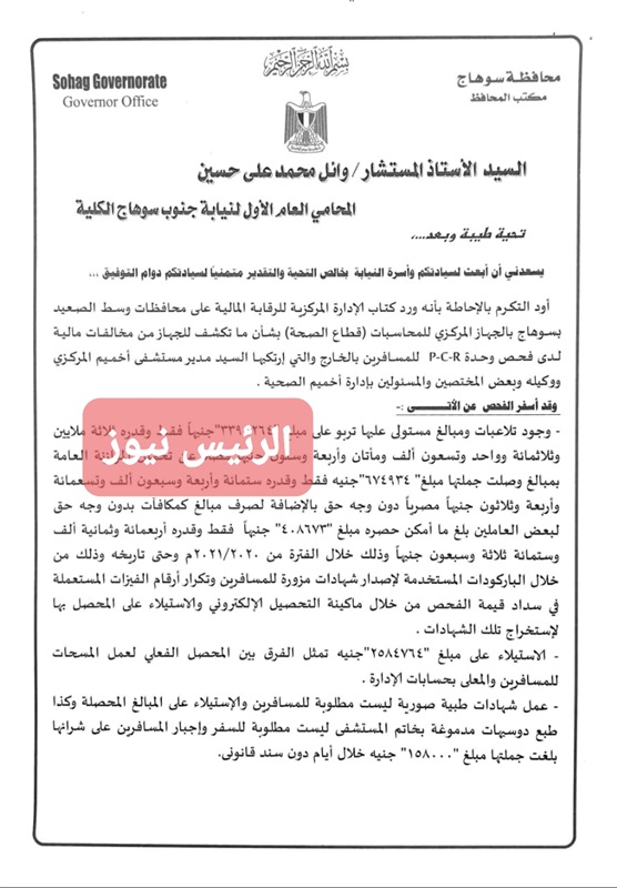 ووفقا للمنشور حصل "الرئيس نيوز" على نسخة منه ، قرر اللواء طارق الفقي محافظ سوهاج إحالة المختصين عن هذه المخالفات إلى النيابة العامة للتحقيق، حيث أرسل محافظ سوهاج خطابًا إلى جهات التحقيق المعنية في هذا الشأن، يطالب فيه بالتحقيق فى المخالفات التى وردت إليه من الإدارة المركزية للرقابة المالية عن الوحدة المحاسبية لمديرية الصحة بشأن ما تكشف لها من مخالفات مالية لدى فحص وحدة pcr للمسافرين للخارج والتى ارتكبها مدير مستشفى أخميم المركزي ووكيله وبعض المختصين والمسؤولين بإدارة أخميم الصحية.