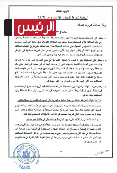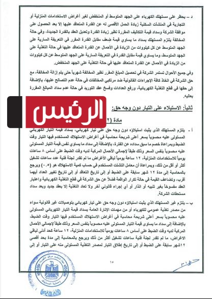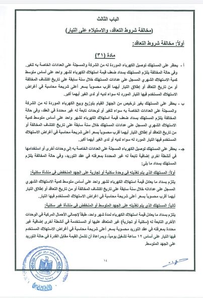 وأضافت اللائحة الى ضرورة الالتزام بالشروط والضوابط الالزامية مع مخالفات شروط التعاقد والاستيلاء بدون وجه حق على التيار المعتمدة من مجلس إدارة الجهاز وأهمها تصوير الواقعة وإرفاق صورة الخطاب المعتمد من الجهة المعنية بتنفيذ الضبطية وتقرير الضبطية مع التأكيد على حق الشركة في اتخاذ الإجراءات القانونية ضد مرتكبي جريمة الاستيلاء على التيار الكهربائي بدون وجه حق في حالة عدم التصالح.