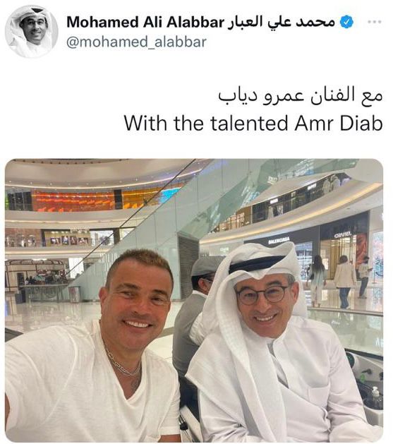 نشر رجل الأعمار الإماراتي محمد العبار عبر صفحاته على مواقع التواصل الاجتماعي صورة تجمعه برفقة صديقه النجم الكبير عمرو دياب وذلك في دبي.