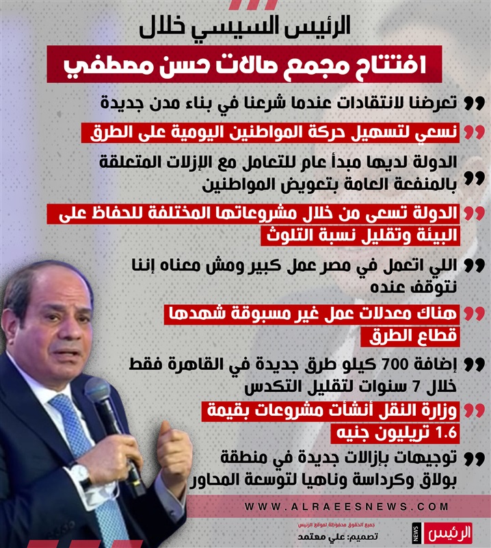 انفوجرافيك| رسائل الرئيس السيسي خلال افتتاح مجمع صالات حسن مصطفي