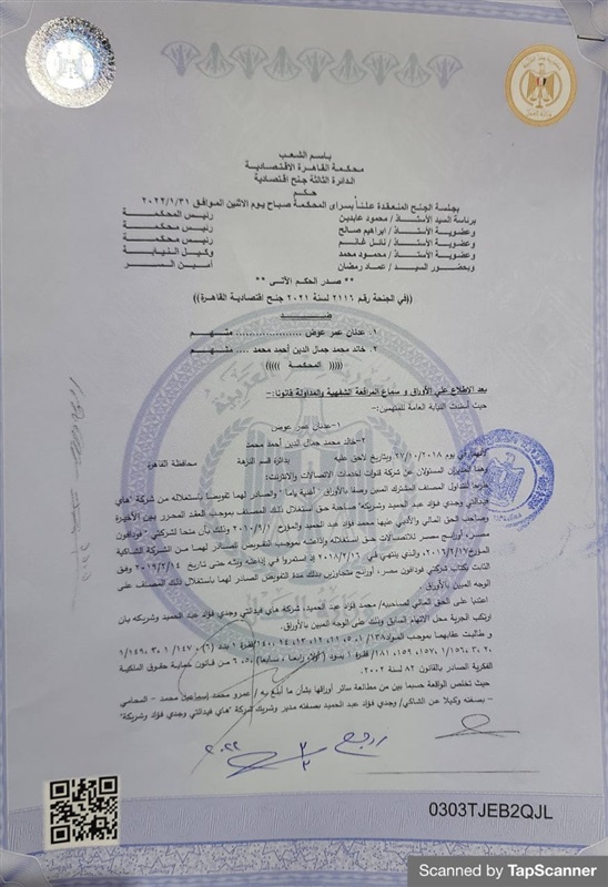 حيث ان الشركة متعاقدة على الأغاني بموجب عقد ساري حتى تاريخه وان الاتهام الغرض منه هروب شركة هاى فديلتي من تسليم البوم غنائي خاص بالفنان محمد فؤاد للشركة رغم استلامها مبلغ وقدرة مليون وخمسمائة وخمسون الف جنية مصري.