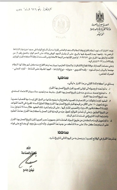 نيوز" على قرار من وزيرة التجارة والصناعة بضوابط جديدة للاستيراد تم توزيعه