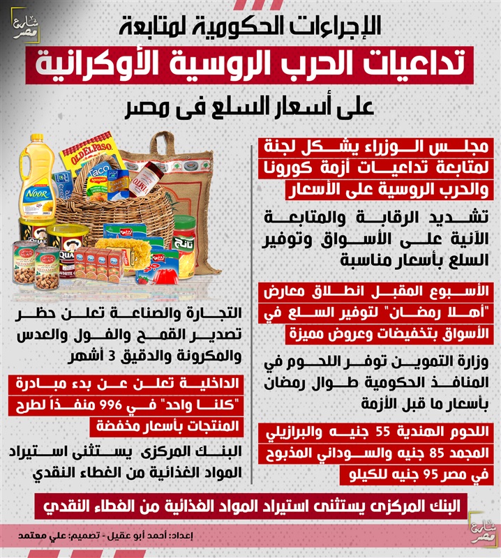 انفوجرافيك| الإجراءات الحكومية لمتابعة تداعيات الحرب الروسية الأوكرانية على أسعار السلع فى مصر