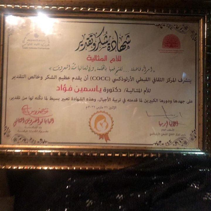 جاء ذلك خلال الحفل الذى أقامه المركز الثقافي القبطي الأرثوذكسي للاحتفال بعيد الأم، وتم تكريم د. ياسمين فؤاد كنموذج للأم المثالية من البابا تواضروس الثاني، بابا الإسكندرية، بطريرك الكرازة المرقسية، بالكاتدرائية.