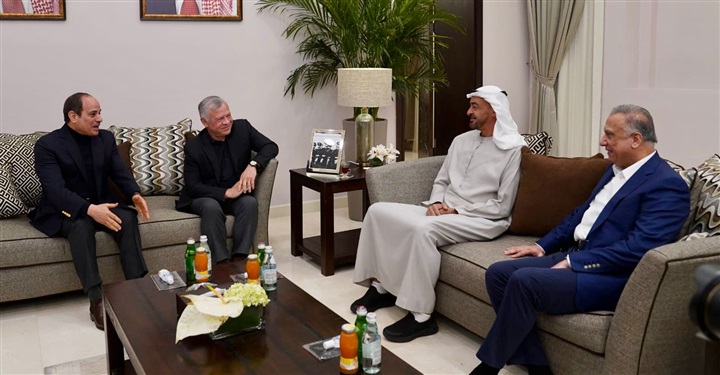 التقى الرئيس عبد الفتاح السيسي اليوم الجمعة بمدينة العقبة بالملك عبد الله الثانى بن الحسين ملك الاردن والشيخ محمد بن زايد آل نهيان ولي عهد أبوظبي، ومصطفى الكاظمي رئيس وزراء العراق".
