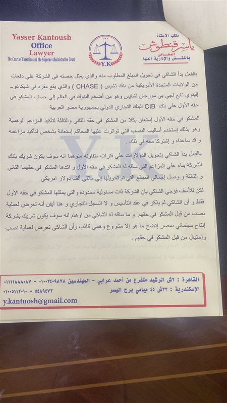 التليفون والمحادثات معه ومحاولة القناعة بالعمل بالإنتاج السينمائي في مصر، وأنه يرغب في تأسيس شركة وينقصه التمويل المالي وأن لديه علاقات طيبة بالعديد من