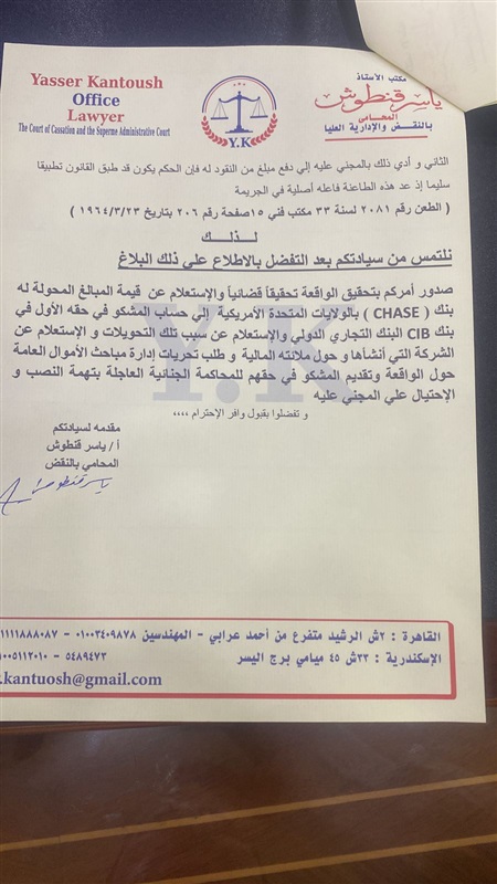 النائب العام بتحقيق الواقعة تحقيقا قضائيا والاستعلام عن قيمة المبالغ المحولة من
