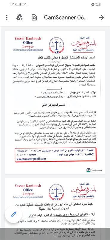 تقدمت السيدة جيهان الدسوقي حفيدة شقيقة كوكب الشرق أم كلثوم، اليوم الاثنين، ببلاغ للنائب العام يحمل رقم ٢٥٤٤٣ لسنة ٢٠٢٢ ضد كل من ناصر دويدار عضو اتحاد كتاب مصر والشاعر هشام الدشناوي رئيس اتحاد كتاب مصر بتهمة التشهير والسب والقذف في حق أم كلثوم.