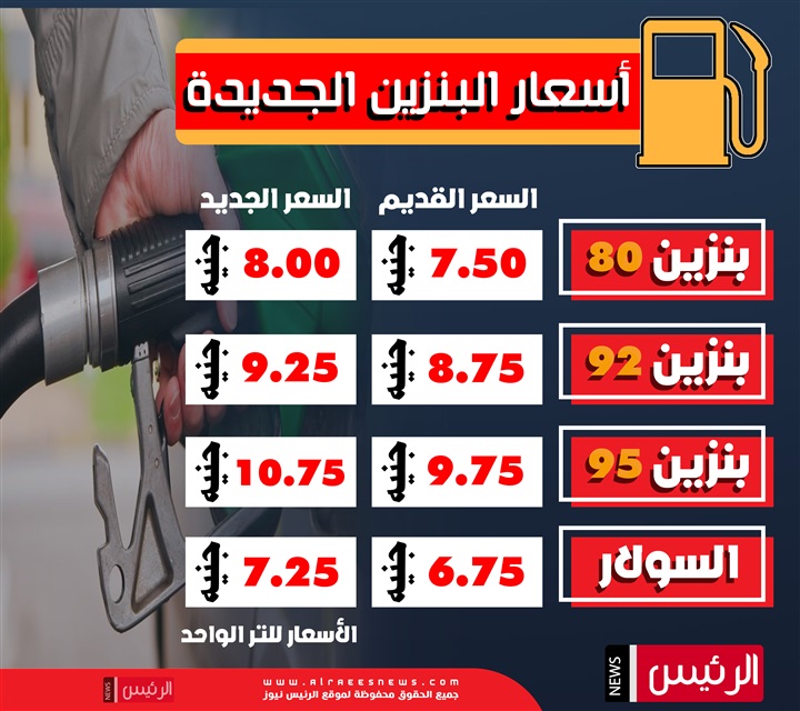 زيادة أسعار البنزين والسولار.. أعلنت لجنة التسعير التلقائي للمنتجات البترولية، عن تعديل سعر بيع منتجات البنزين بأنواعه الثلاثة اعتبارا من الساعة التاسعة صباح اليوم الأربعاء، كالأتى 8.00 جنيه للتر البنزين 80 و9.25 جنيه للتر البنزين 92 و10.75 جنيه للتر البنزين 95.