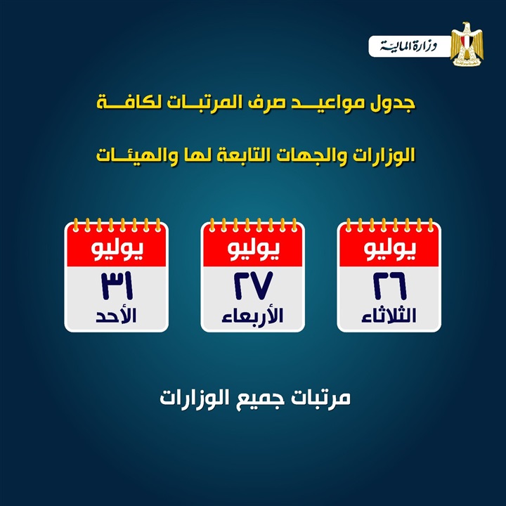 المالية تعلن مواعيد صرف مرتبات شهر يوليو