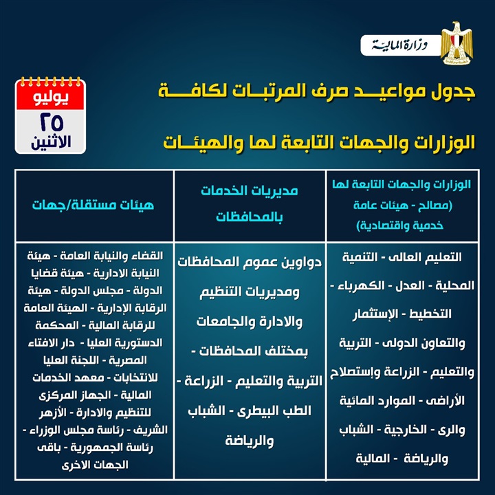 أعلنت وزارة المالية، أنه اعتبارا من يوم الأحد المقبل سيتم البدء في صرف مرتبات شهر يوليو الجاري.