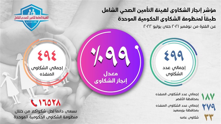 أضاف أن الهيئة العامة للتأمين الصحي الشامل تحرص على الاستجابة السريعة والفورية لشكاوى المواطنين الواردة إليها عبر منصة «الشكاوى الموحدة» بمجلس الوزراء، على النحو الذي يُسهم في تطوير وتحسين الخدمات المقدمة للمنتفعين، حيث تلقينا نحو ٤٩٩ شكوى، خلال الفترة من نوفمبر ٢٠٢١ حتى يوليو الحالي، منها ١٨٧ شكوى بالأقصر، و٢٧٩ ببورسعيد، و٣٣ شكوى عامة، وتم حل ٩٩٪ منها، مثمنًا جهود جميع القائمين على منظومة «الشكاوى الموحدة» وممثلي وزارة الصحة المشاركين بها على سرعة الاستجابة والتنسيق الفعَّال لضمان تلقي المواطنين للخدمات الطبية بكفاءة عالية تحت مظلة التأمين الصحي الشامل.