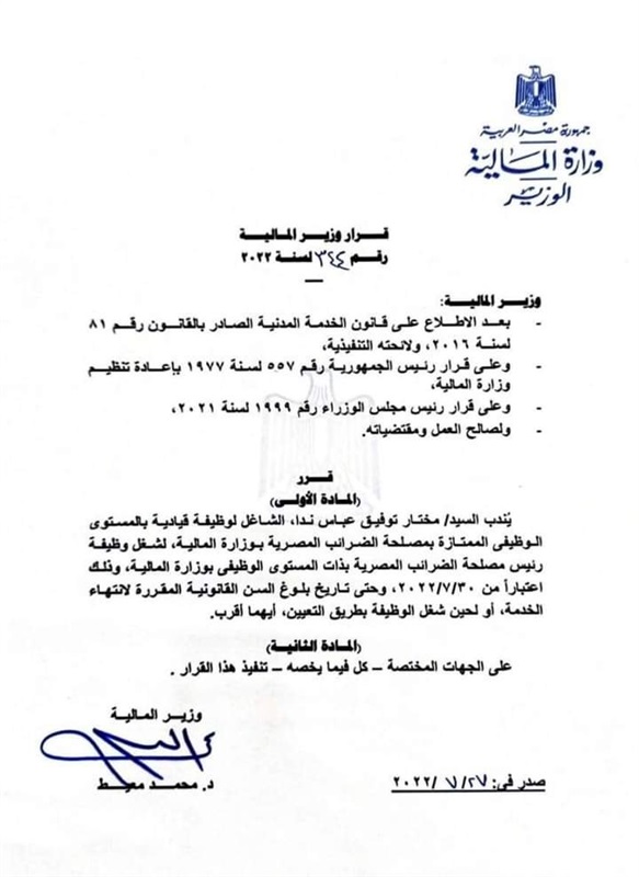 قرر د. محمد معيط وزير المالية تعيين مختار توفيق رئيساً جديداً لمصلحة الضرائب المصرية خلفاً لدكتور رضا عبد القادر الذي انتهت مدة خدمته على أن يتولى الأخير منصب مساعداً أول لوزير المالية لشئون الضرائب.