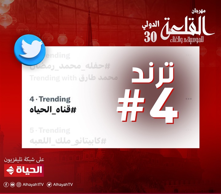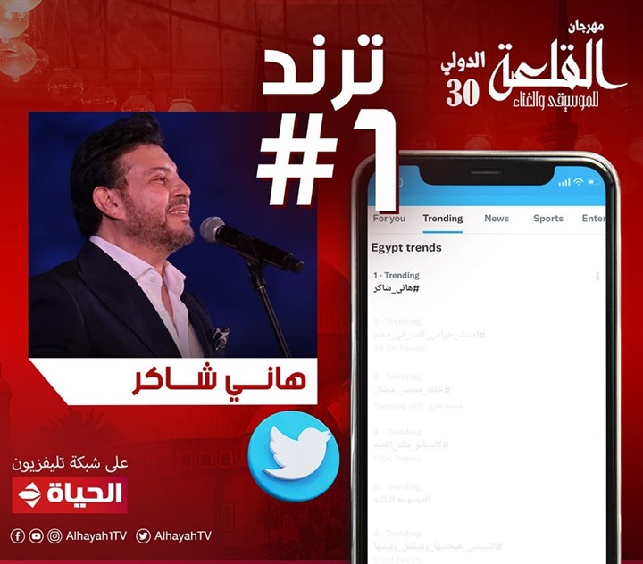 تصدر هاني شاكر علي شبكة تليفزيون الحياة ترند رقم ١ على منصة التغريدات القصيرة تويتر خلال الحفل الذي أذاعته شبكة تليفزيون الحياة حصريًا، الجمعة، وحضره العديد من محبي الفن والغناء، كما تصدرت قناة الحياة تريند رقم "4" على منصة تويتر بعد انفرادها بحفلة هاني شاكر والنجمة نادية مصطفى بمهرجان القلعة للموسيقى.