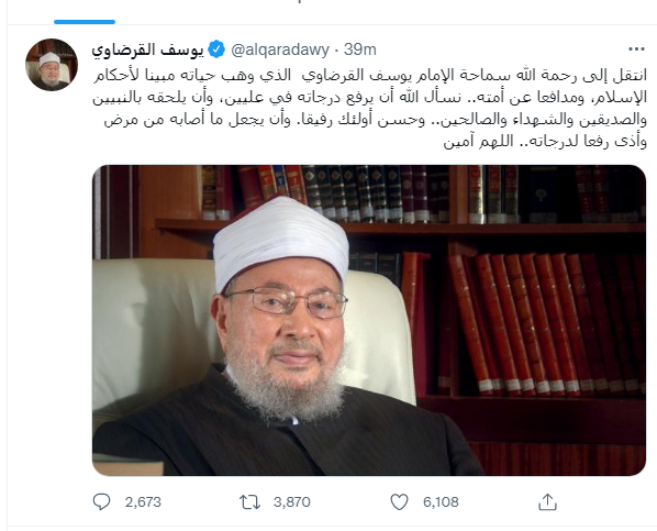 من جهتها نعت وزارة الأوقاف القطرية القرضاوي، وقالت إن "الأمّة العربية والإسلامية فقدت عالمًا جليلًا من أبرز علمائها، لطالما دافع عن القضايا الإسلامية".