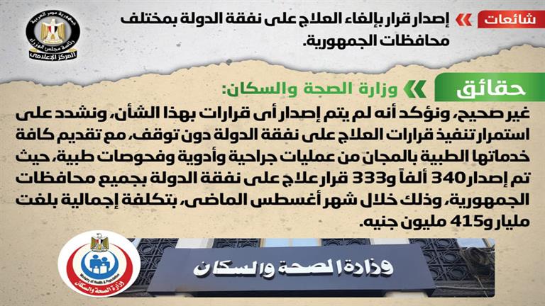 وتواصل المركز الإعلامي لمجلس الوزراء مع وزارة الصحة والسكان، والتي نفت تلك الأنباء، مُؤكدةً أنه لا صحة لإلغاء العلاج على نفقة الدولة بمختلف محافظات الجمهورية، وأنه لم يتم إصدار أي قرارات بهذا الشأن.