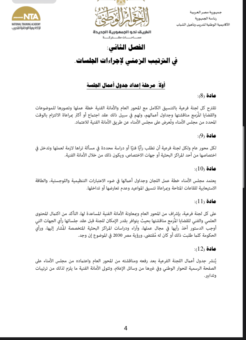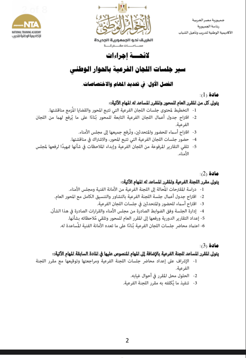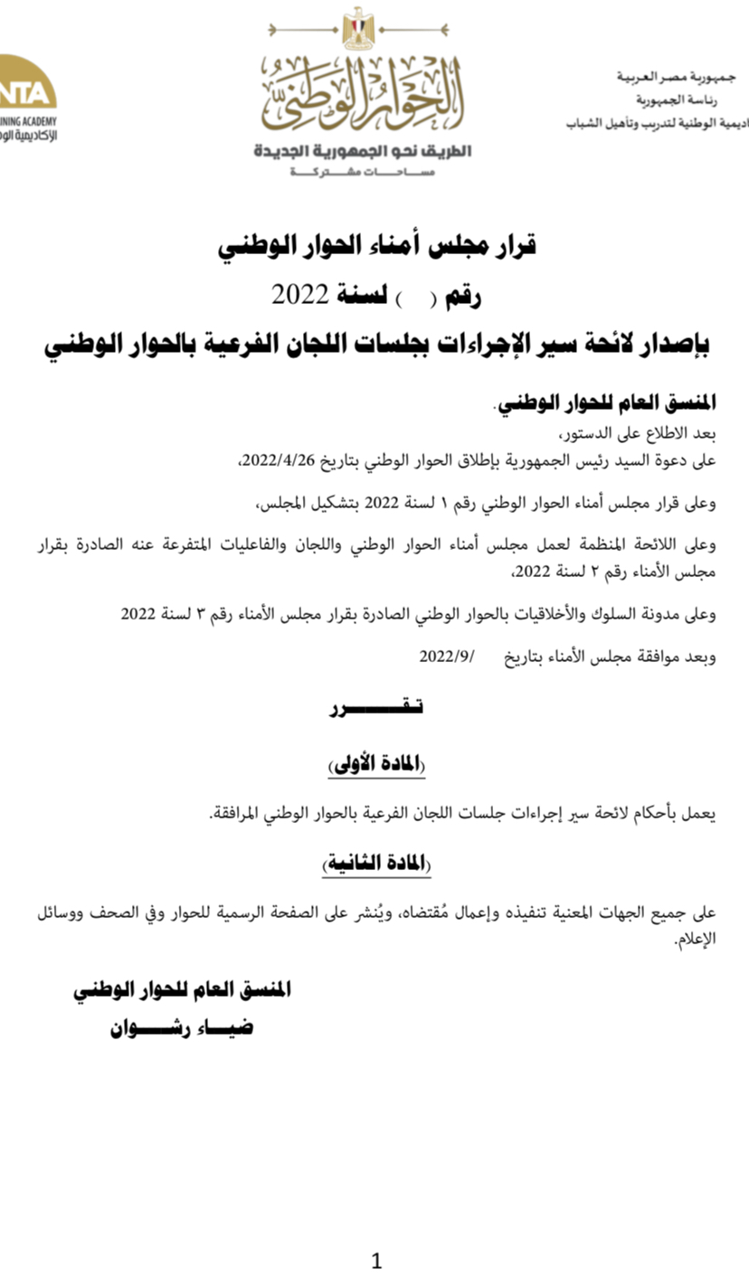 استقر مجلس أمناء الحوار الوطني على إصدار لائحة سير الإجراءات في جلسات اللجان الفرعية بالحوار الوطني، فيما يخص تحديد المهام والاختصاصات لكل من المقرر العام ومساعده، ومقرري اللجان الفرعية ومساعديهم، ومجلس الأمناء والأمانة الفنية، بالإضافة إلى الترتيب الزمني لإجراءات الجلسات وإدارتها، وصياغة المخرجات.
