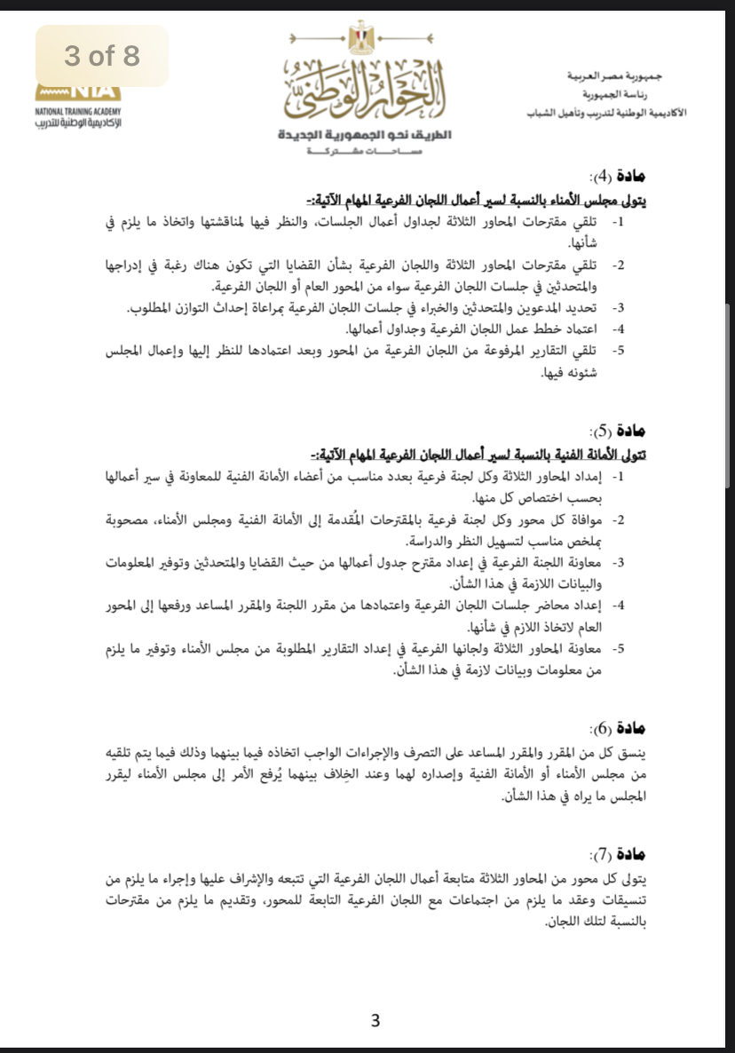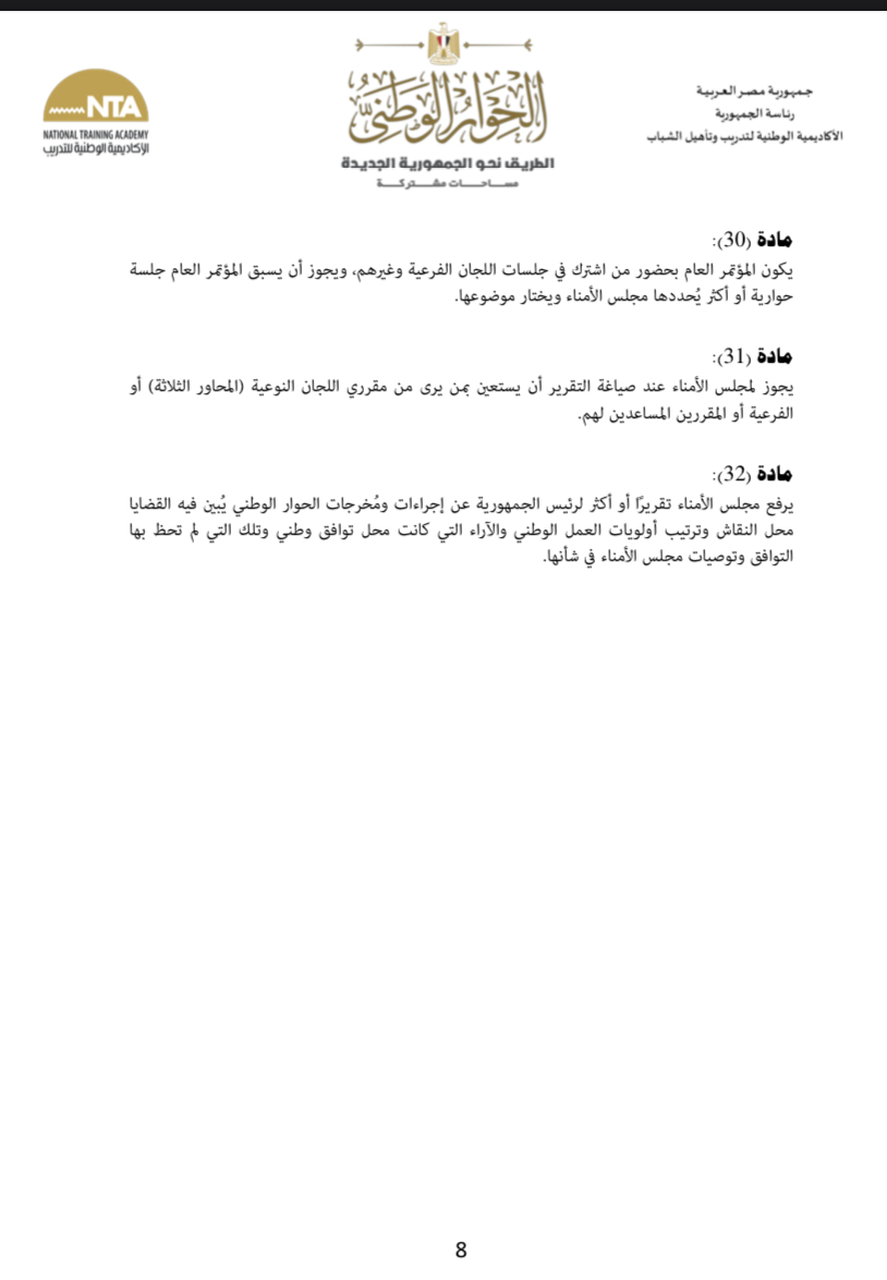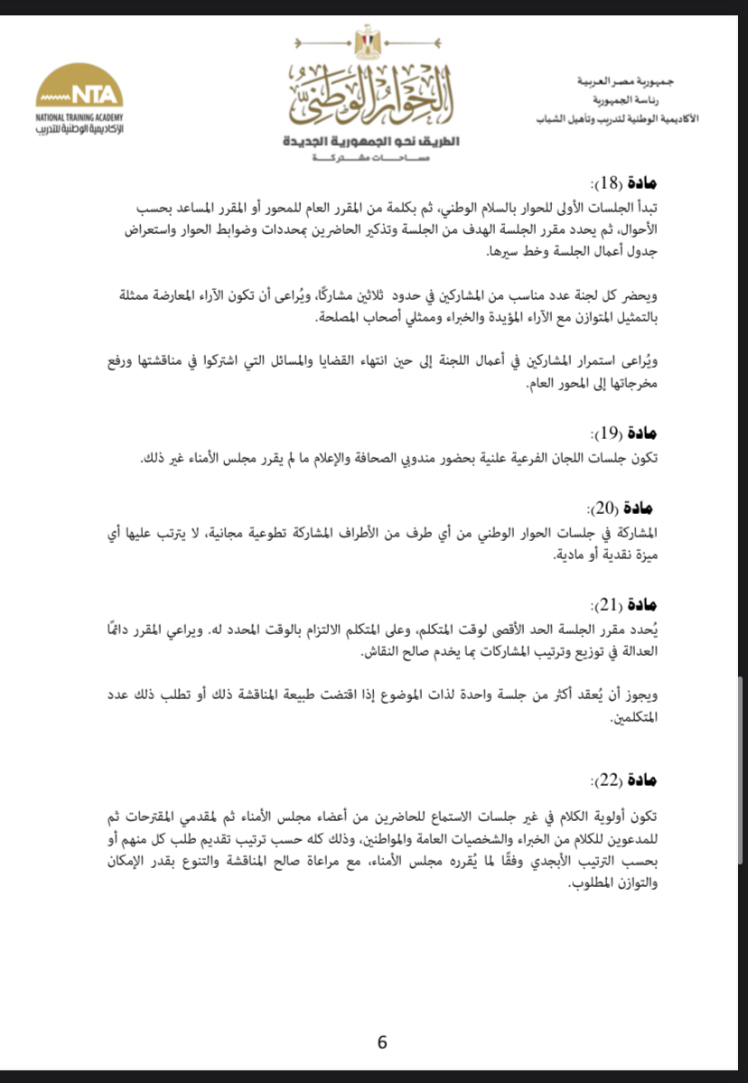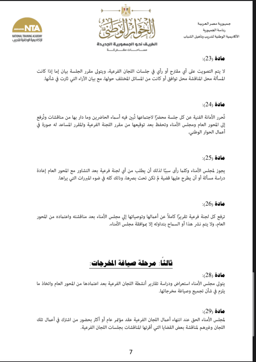 استقر مجلس أمناء الحوار الوطني على إصدار لائحة سير الإجراءات في جلسات اللجان الفرعية بالحوار الوطني، فيما يخص تحديد المهام والاختصاصات لكل من المقرر العام ومساعده، ومقرري اللجان الفرعية ومساعديهم، ومجلس الأمناء والأمانة الفنية، بالإضافة إلى الترتيب الزمني لإجراءات الجلسات وإدارتها، وصياغة المخرجات.