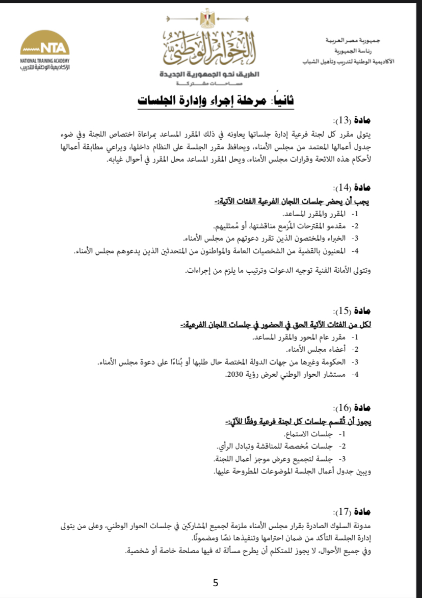 كما انتهى مجلس الأمناء، من صياغة كتيب إرشادات بعض قواعد السلوك للمقررين والمقررين المساعدين والمشاركين بجلسات الحوار الوطني.