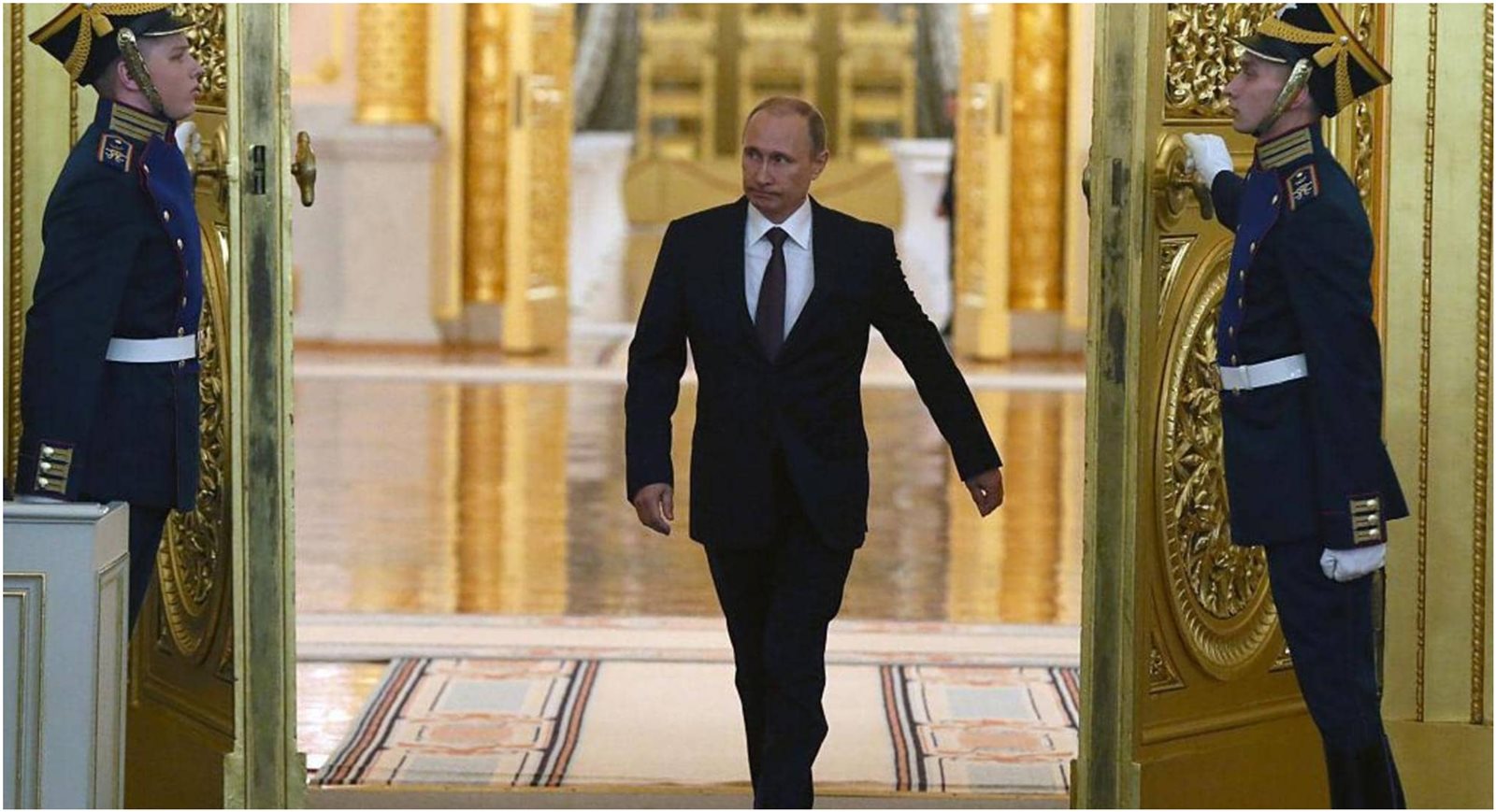 واجتزأ بوتين من الصورة ليُركّب على صورة أخرى ملتقطة في العام 2017 ومنشورة على موقع الكرملين ليبدو وكأنّه يدخل من الباب الذي يفتحه الجنديان.