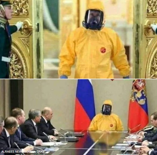 وفي التفاصيل، تداول مستخدمون لمواقع التواصل الاجتماعي منشورًا يضمّ صورتين يبدو في الأولى بوتين بزيّ أصفر وقناع وقفازات، وفي الثانية يبدو الرئيس الروسي جالسًا في اجتماع مرتديًا الزيّ نفسه.