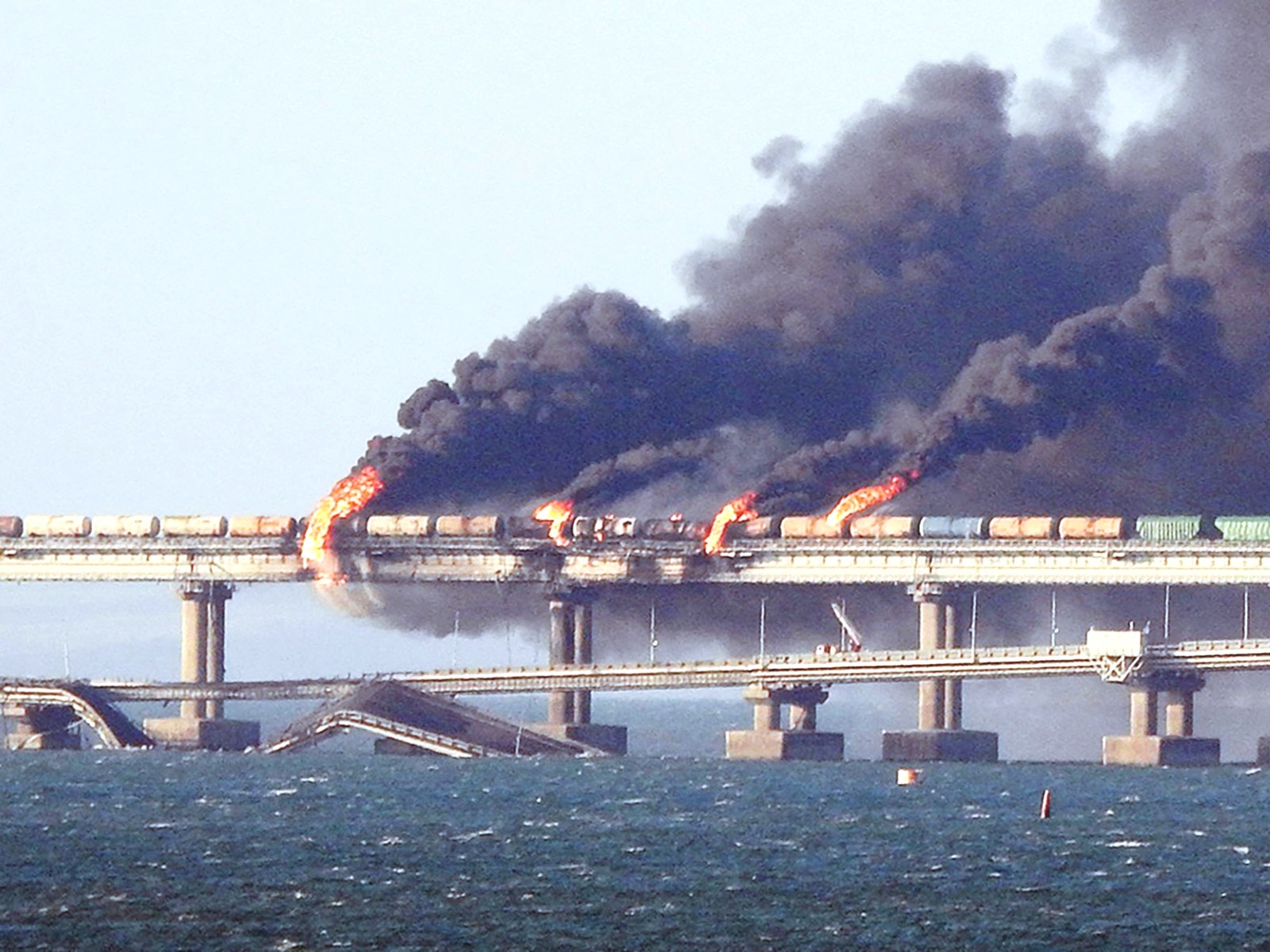 وأفادت اللجنة الوطنية الروسية لمكافحة الإرهاب بأنه تم تفجير شاحنة على جسر القرم فجر اليوم، ما أدى إلى اشتعال النيران في عدد من صهاريج الوقود في قطار كان يسير عبر الجسر. وأفادت وسائل الإعلام الروسية بأن الحريق على جسر القرم نتج عن تفجير سيارة مفخخة.