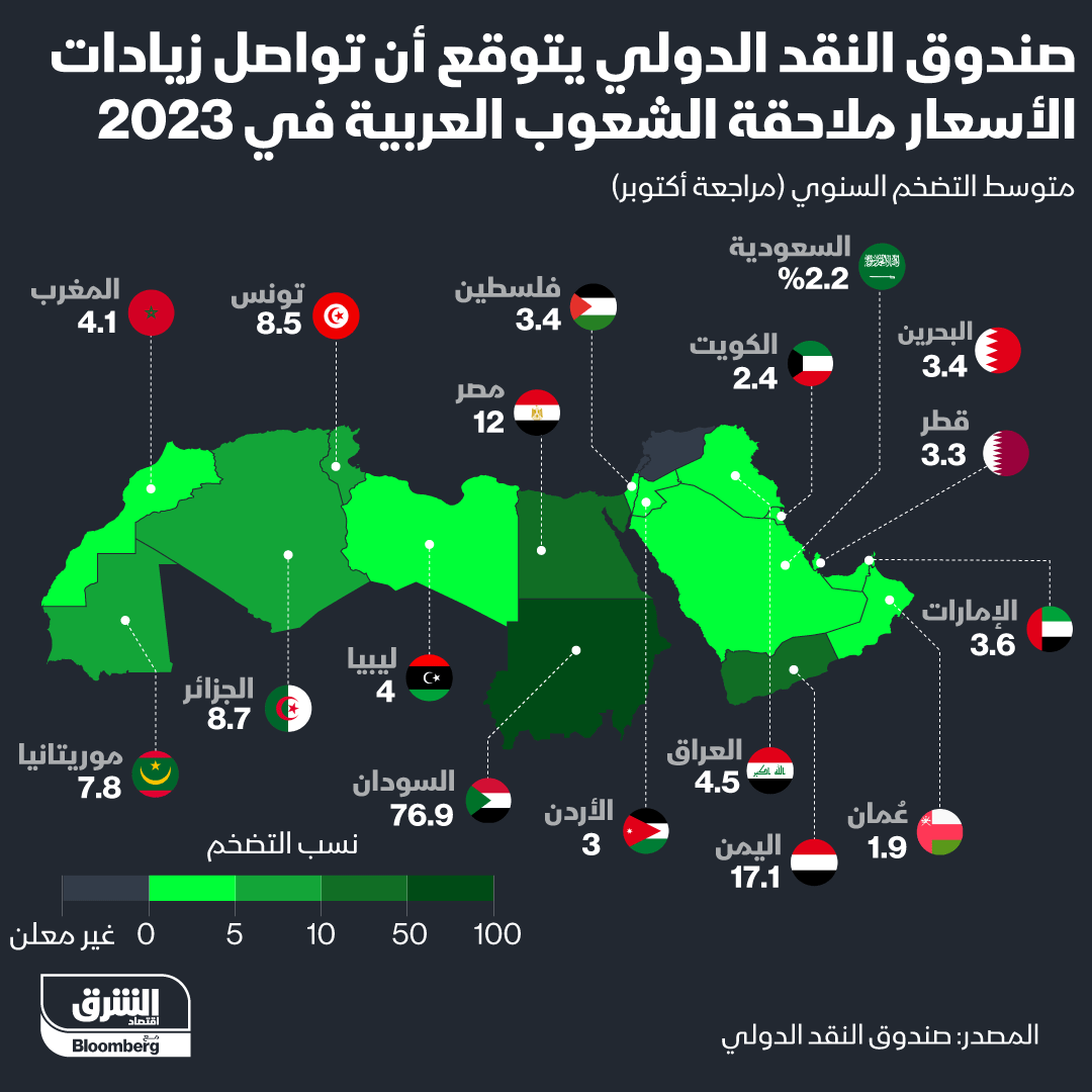 على أن تكون الأعلى في السودان بمتوسط معدل تضخم سنوي يصل إلى 76.9%، واليمن في المرتبة الثانية بمعدل 17.1%، بينما تأتي مصر في المرتبة الثالثة بمعدل 12%.