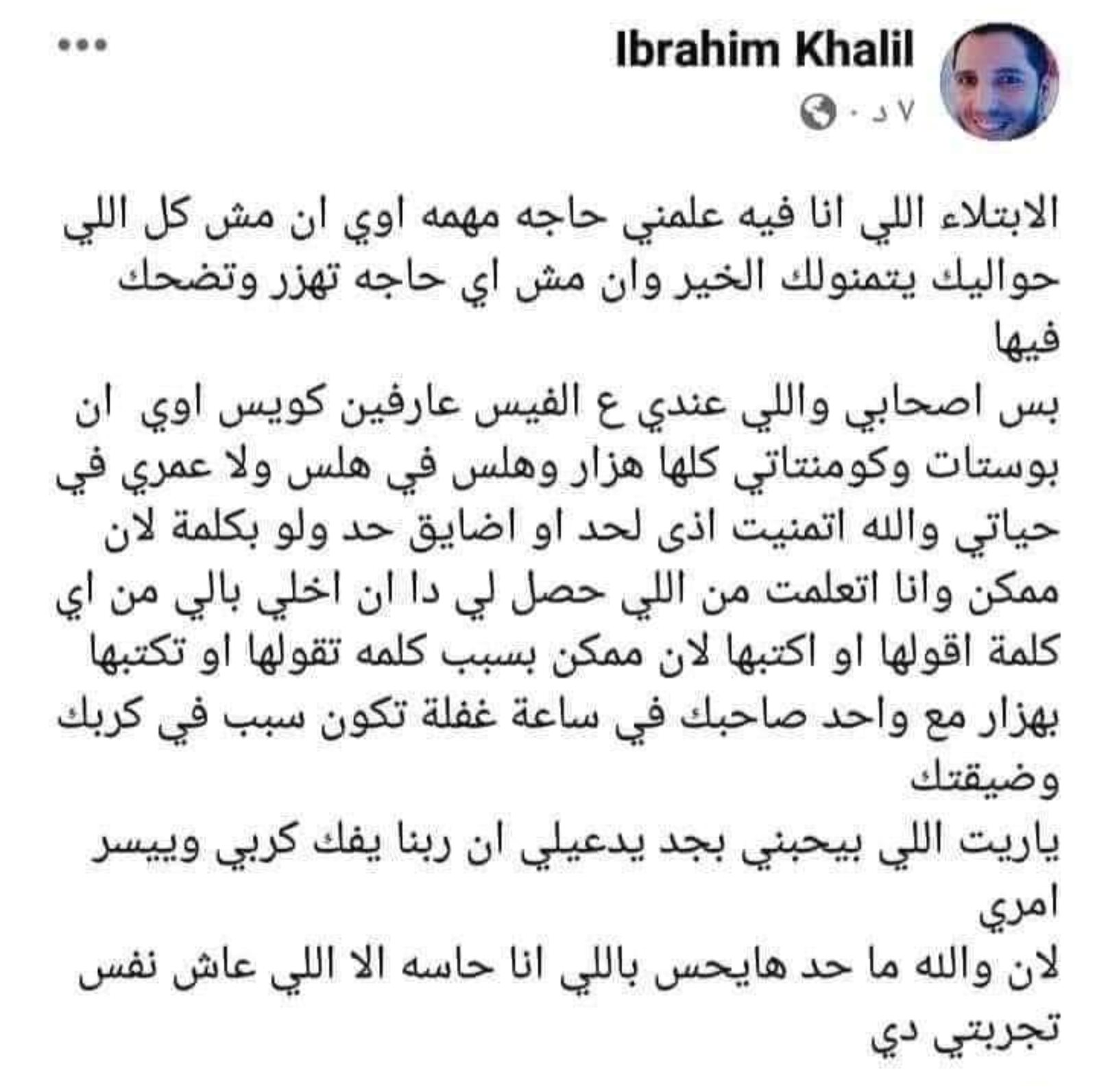 وكتب إبراهيم خليل منشور على فيس بوك: «الموقف اللي أنا فيه علمني بعد كده أخد بالي من كل كلمة بقولها ومن كل كلمة بكتبها أنا حقيقي في كرب شديد وكنت بهزر».