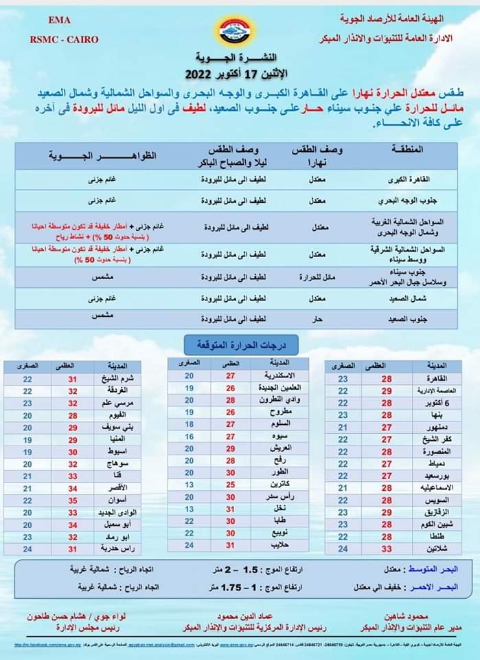توقعت هيئة الأرصاد الجوية، أن يسود اليوم الإثنين، طقس معتدل الحرارة على شمال البلاد حتى شمال الصعيد مائل للحرارة على جنوب سيناء حار على جنوب الصعيد.
