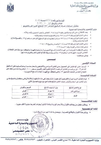 وأشار القرار إلى أنه تيسرا على المواطنين في الحصول على الخبز السياحي والإفرنجي بأسعار مناسبة يتم تسليم طن الدقيق الفاخر 72% لمن يرغب من المخابز المرخصة لإنتاج الخبز الحر والفينو بسعر 10 آلاف للطن، وذلك من مطاحن القطاع من الخاص المنتجة للدقيق 72% والتي تتعاقد مع الهيئة العامة للسلع التموينية على أن تقوم المخابز بعمل إعلان على المخبز بالأوزان والأسعار المحددة، بحيث سيكون سعر رغيف الفينو 40 جراما بـ 75 قرشا، 60 جراما بجنيه واحد، والخبز السياحي وزن 75 جرام بجنيه واحد.