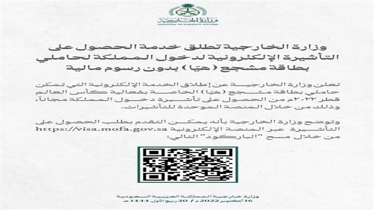 1- السماح لحاملي بطاقة مشجع "هيّا" بالدخول للمملكة قبل انطلاق بطولة كأس العالم بـ10 أيام بعد الحصول على تأشيرة إلكترونية من خلال المنصة الوطنية الموحدة للتأشيرات. وستقوم الوزارة بالإعلان لاحقًا عن كيفية تقديم طلب التأشيرة وآلية الحصول عليها.