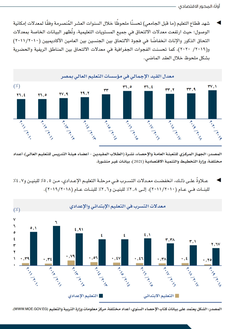 أعلنت الحكومة انخفاض معدلات التسرب من التعليم فى مرحلة التعليم الإعدادى، من 5.5% للبنين و4.7% للبنات عام 2010،2011، إلى 2.8% و2.6% للبنات عام 2018-2019.
