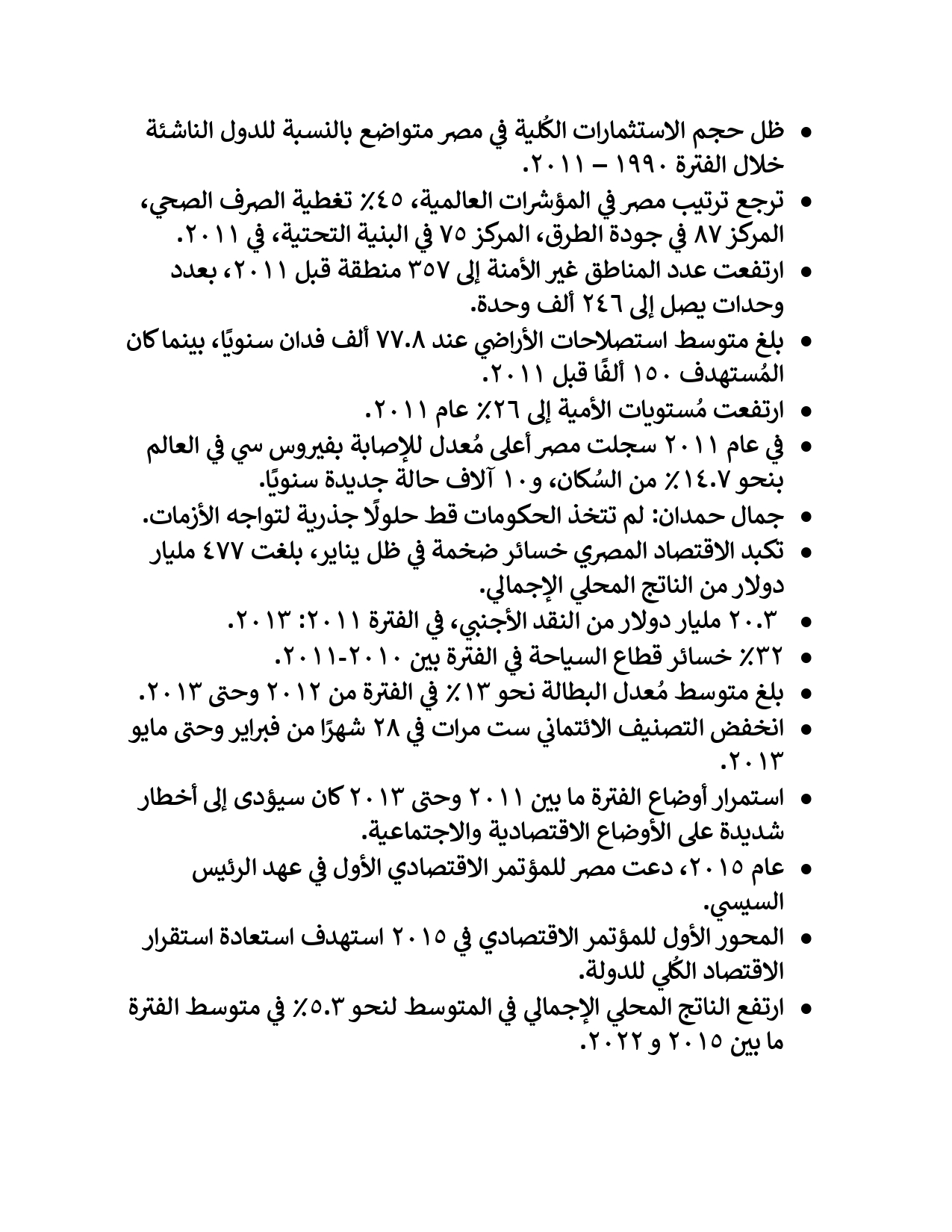 وتابع أنه من هنا جاء تكليف الرئيس عبد الفتاح السيسي للحكومة بتنظيم المؤتمر الاقتصادي؛ لمناقشة أوضاع ومستقبل الاقتصاد المصري والخروج بخارطة طريق واضحة لهذا الاقتصاد خلال الفترة القادمة.